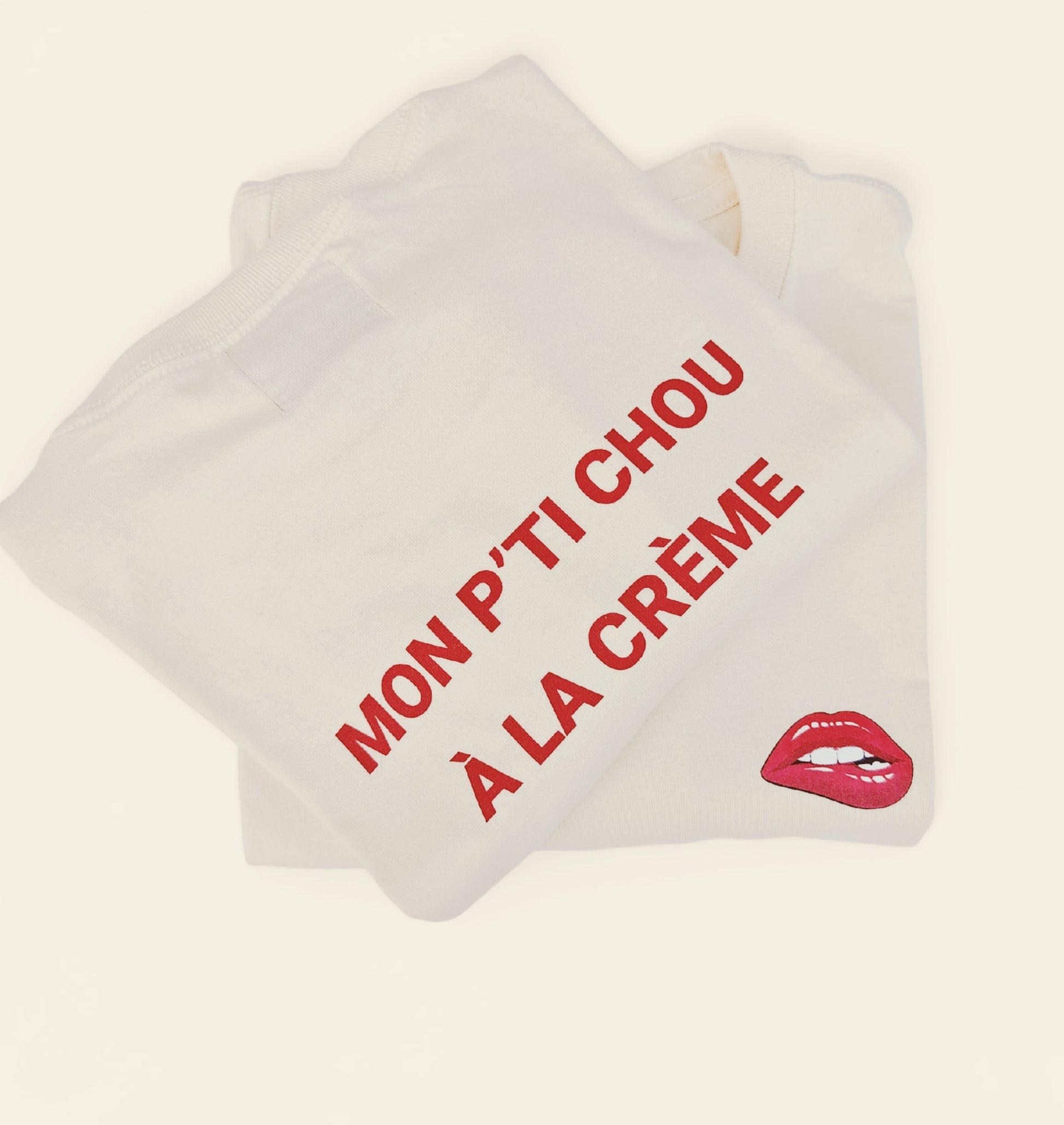 "Mon P’tit Chou à la Crème" is a French term of endearment—think sweetheart, but cuter and creamier. It’s the perfect mix of cheeky and chic, made for those who love their fashion with a wink and a smile.